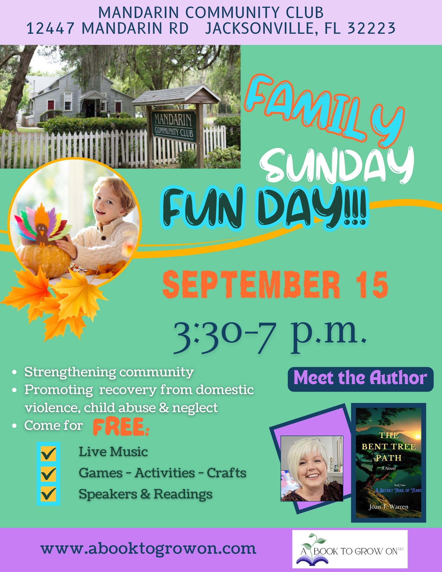 A Book to Grow On, LLC is proud to sponsor a local free event for the northeast Florida community. Conveniently located in the Mandarin section of Jacksonville, Florida, the event, Family Sunday Fun Day, is open and free to the public on Sunday afternoon, September 15, 2024.